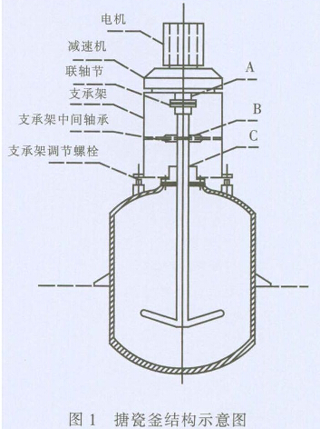 (4)設(shè)備整體找正找平。因?yàn)閷?shí)際上密封的安 裝基準(zhǔn)面是釜?dú)んw,而攪拌的安裝基準(zhǔn)面既有釜 殼體還有支架。就是說在整體安裝后,既要保證攪 拌和釜體的垂直對(duì)中,又要保證攪拌和密封的同 軸度,即從電機(jī)輸出軸端(聯(lián)軸節(jié)處)點(diǎn)A,到中間 支承軸承點(diǎn)B,再到密封中心點(diǎn)C,三點(diǎn)ABC為一 直線且垂直于水平面。參見圖1。
